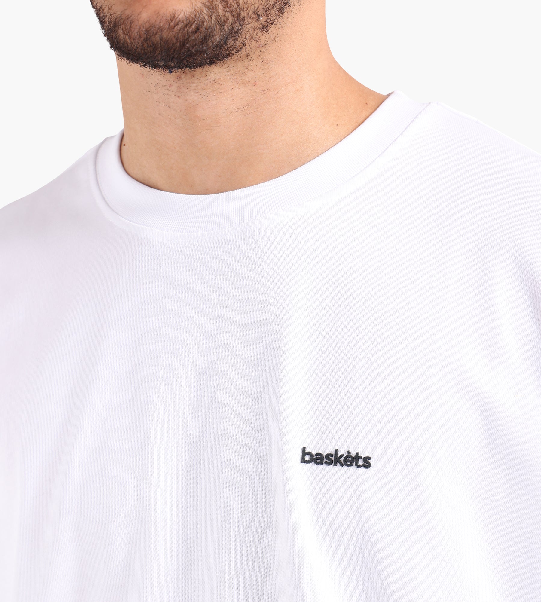 This is the Baskèts Modern Essential Tee in White, cut from 260gsm organic cotton. It features a bold logo print, a relaxed fit, and a round neckline, making it perfect for everyday wear.
