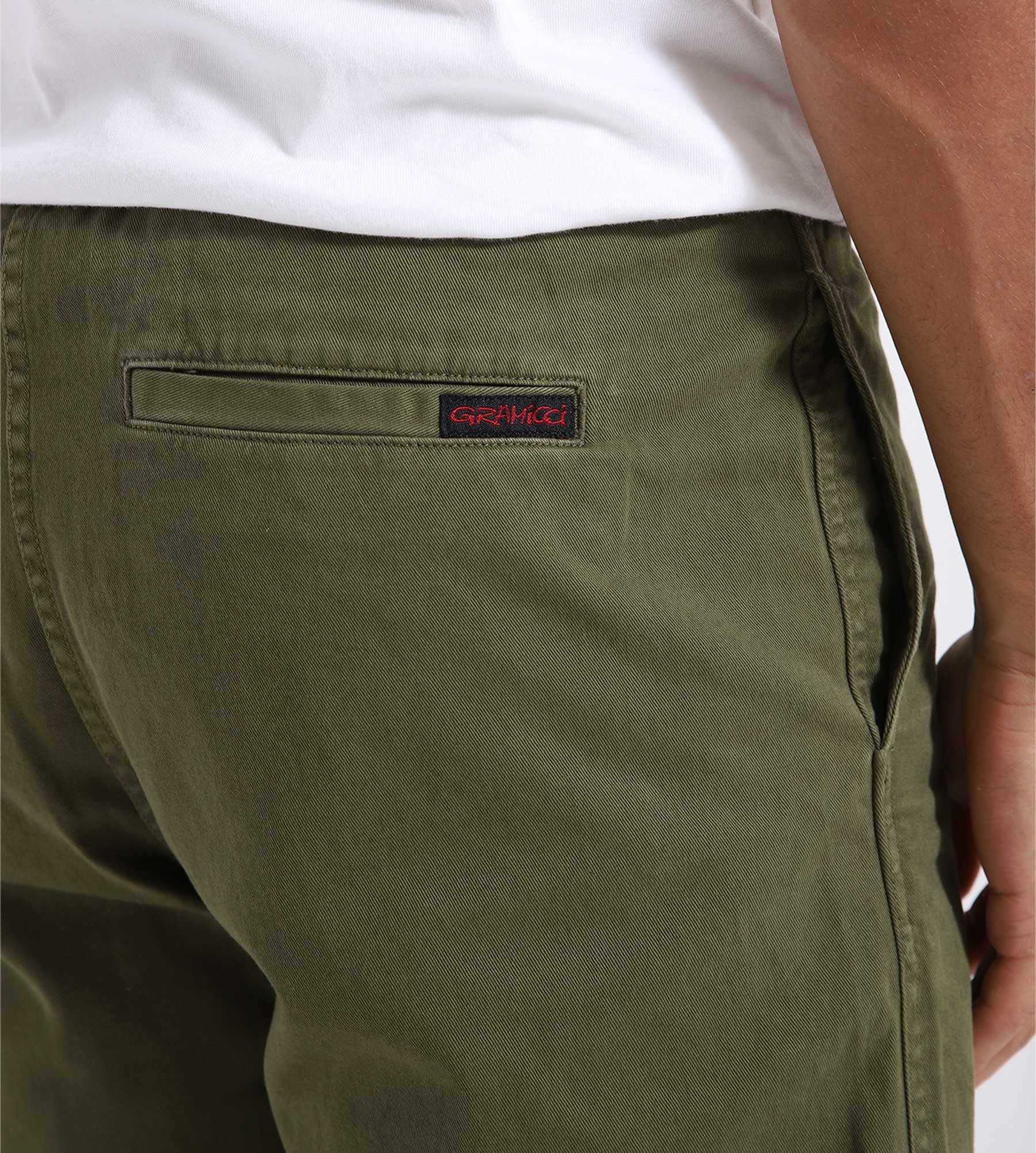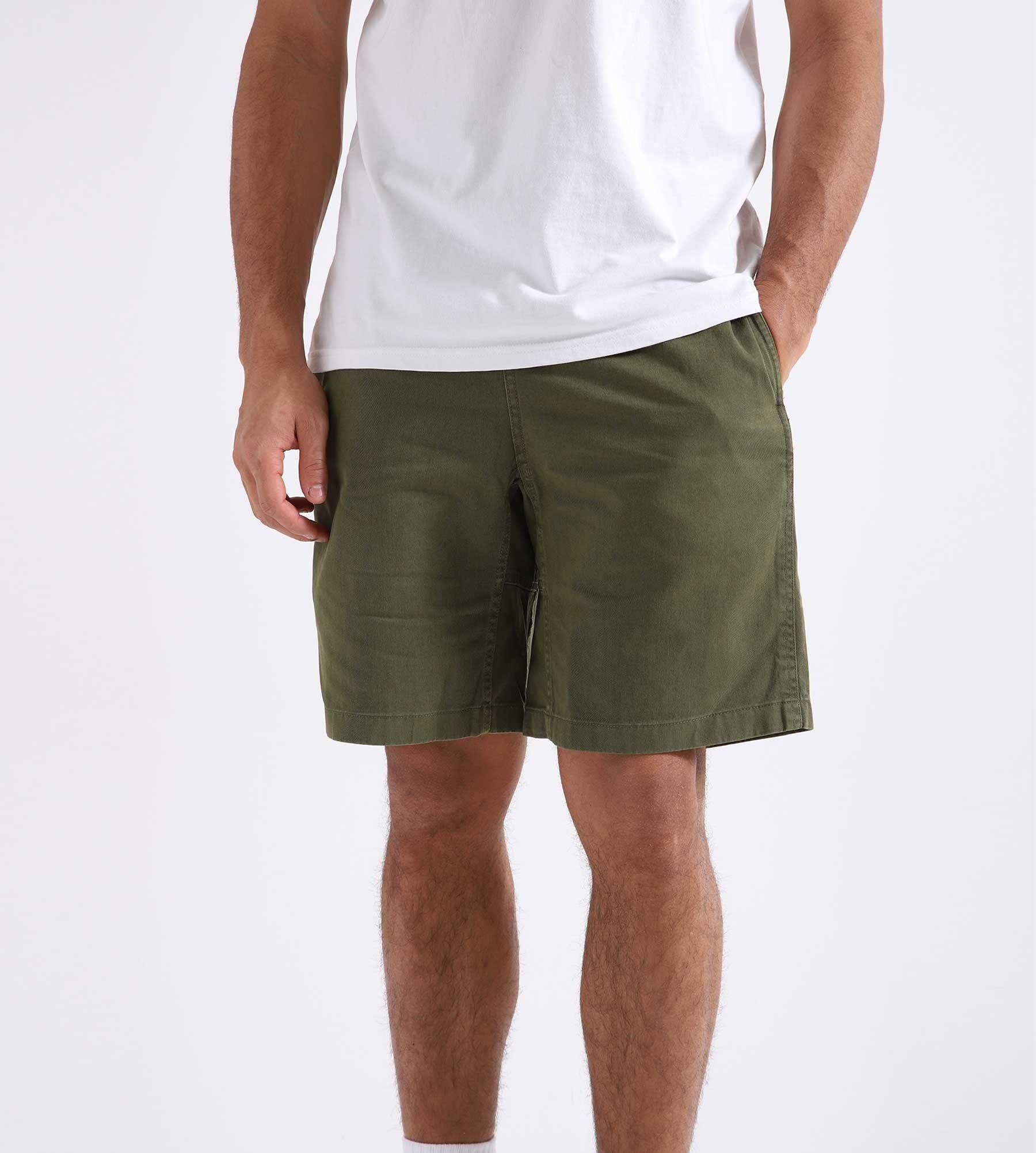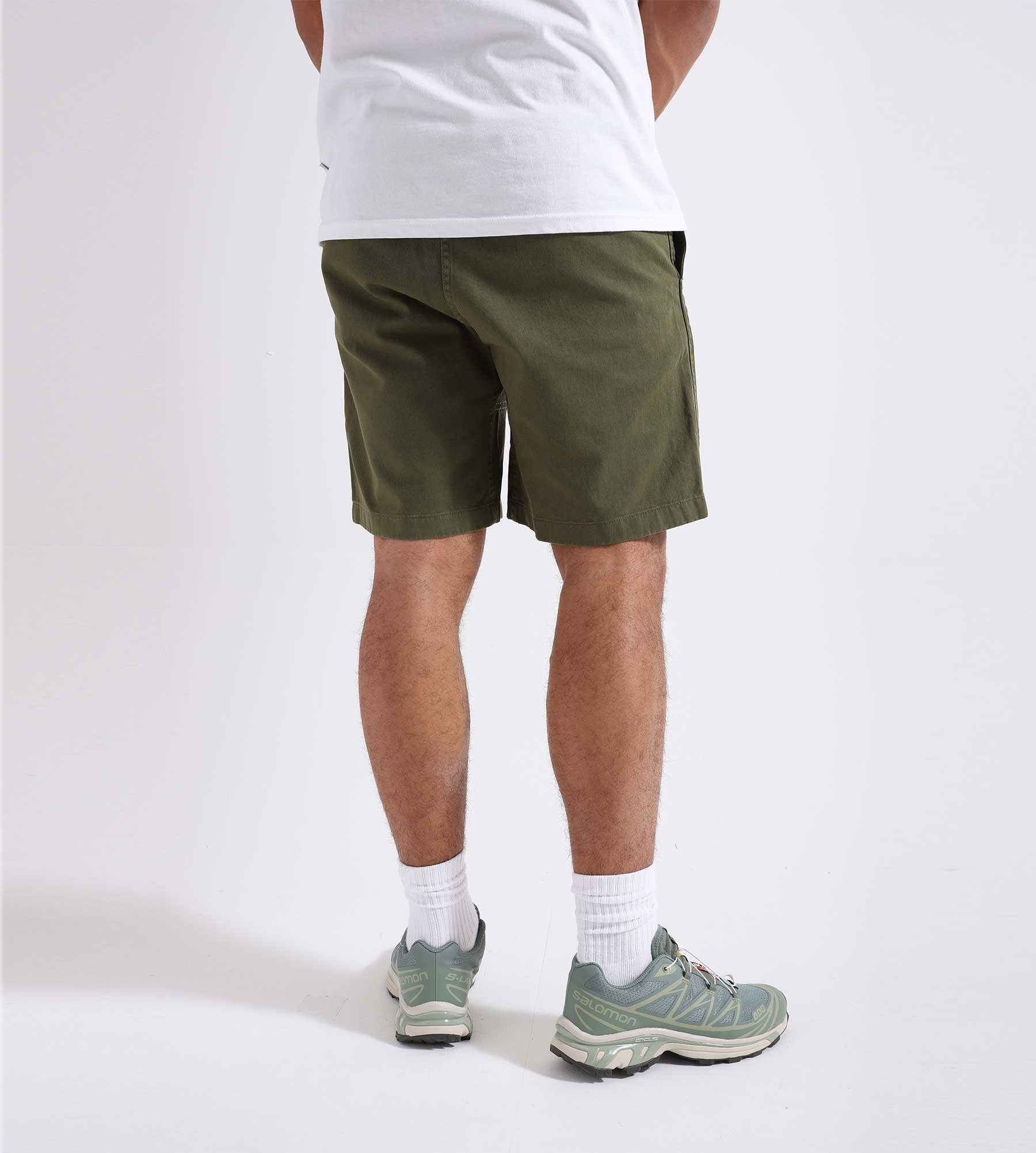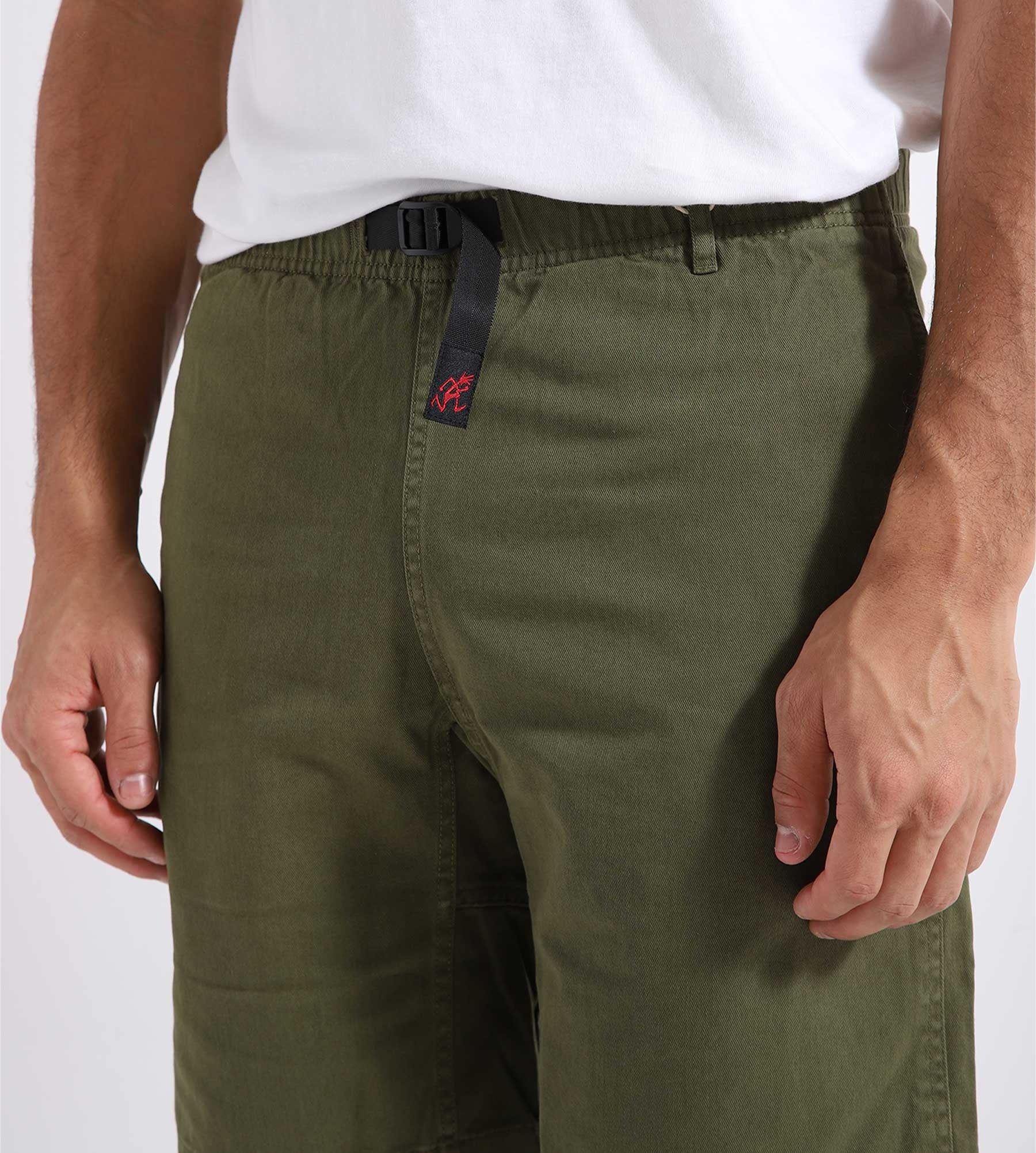 The Gramicci G-Short in Olive is made from 100% cotton, offering comfort and breathability. These shorts feature a loose fit with an elastic waistband and adjustable drawstring. The design includes two side pockets and back pockets.