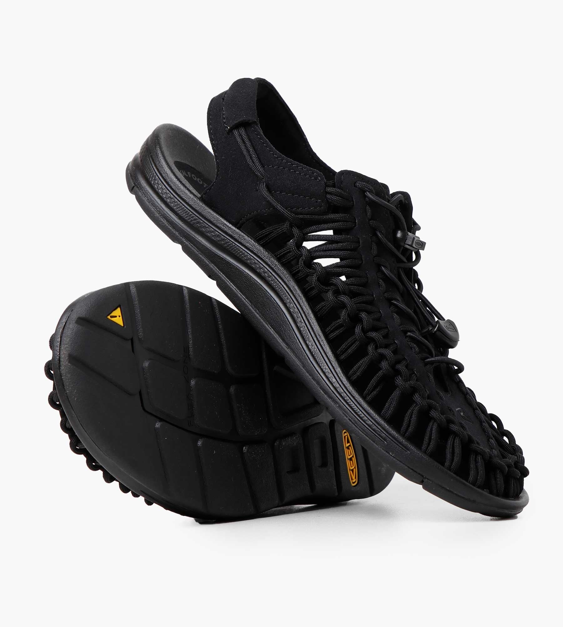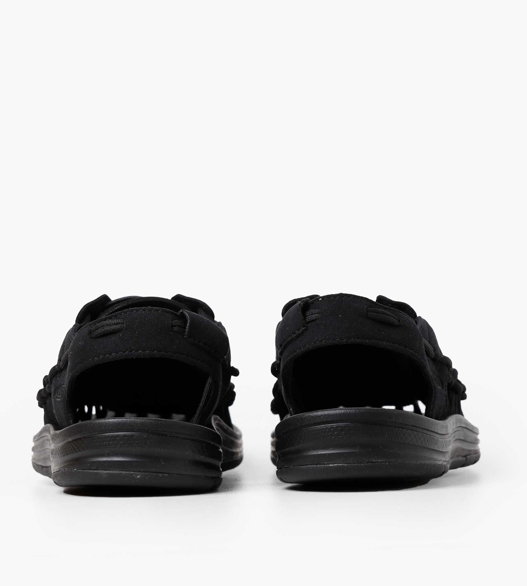 The KEEN Women’s Uneek Round Cord Sandals in Black/Black are crafted with a durable polyester braided cord featuring a nylon core, offering a flexible yet sturdy fit. The lightweight PU midsole and a metatomical footbed with a microfiber cover ensure lasting comfort and support for all-day wear. A non-marking rubber outsole with razor siping provides reliable traction on varied surfaces, making these sandals ideal for outdoor adventures.